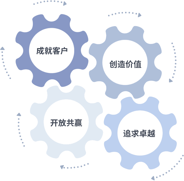成就客户是一切决策的出发点,,,创造价值是衡量所有工作的标准,,追求卓越是我们做事做人的态度,,,开放共赢是我们的格局也是最终的结果。。。。价值观的齿轮环环相扣,,,,推动着组织里的每个人不断向前。。。。