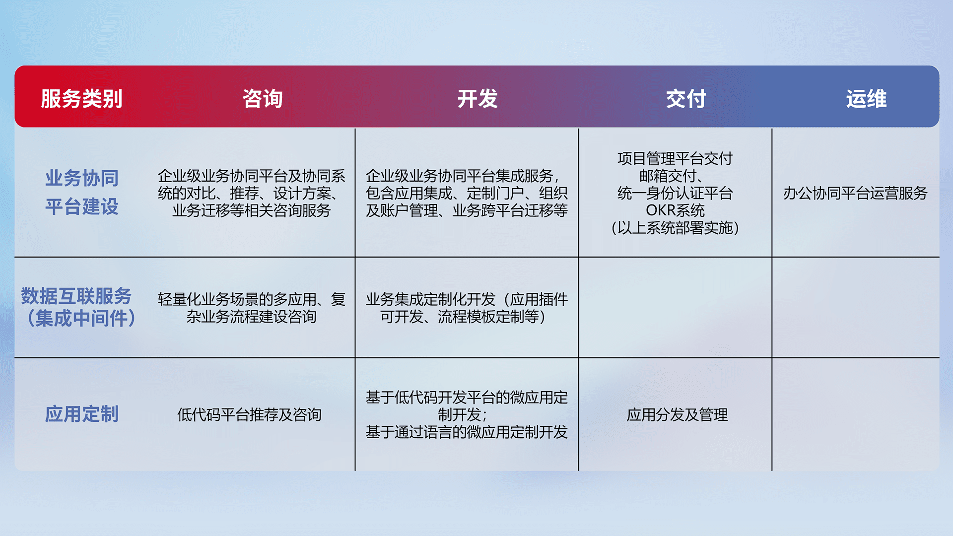 针对钉钉、、、、企微、、、、IDaas等平台级产品提供产品的规划、、方案、、、、交付、、、、定制化开发等服务,,,实现如统一协同办公、、智能客户服务、、混合会议管理、、、、智能数据查询、、等业务场景,,实现数字化转型。。。