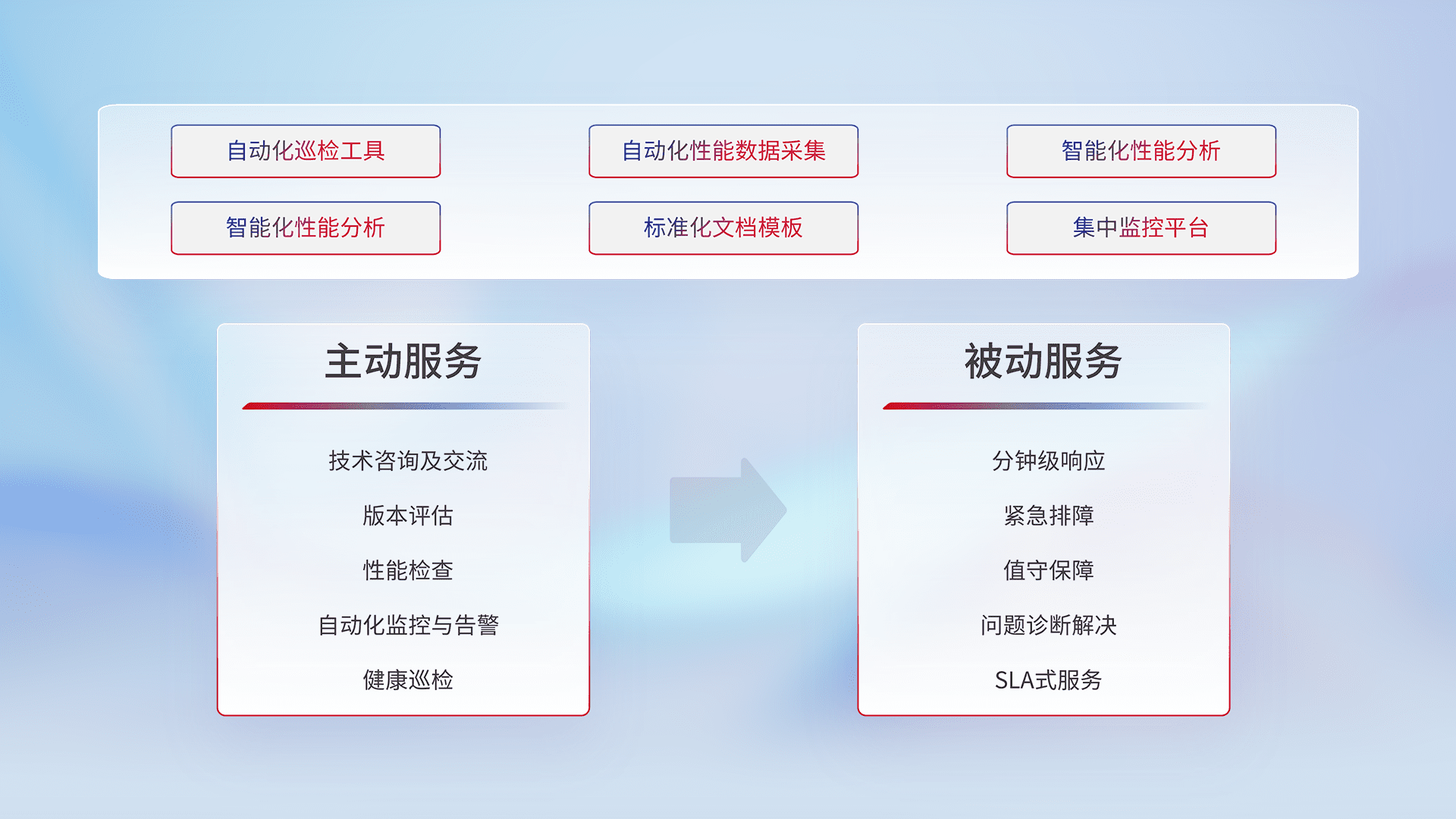 智能化工具和标准化文档,,保障服务质量,,,提供主动服务(包含技术咨询、、、、版本评估、、性能检查、、自动化监控与告警、、、健康巡检)和被动服务包含(分钟级响应、、、紧急排障、、、、值守保障、、、、问题诊断解决、、、、SLA服务)。。。。
